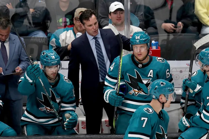 San Jose Sharks head coach David Quinn stands behind bench with center Kim Kosin (10) and center Mikael Granlund (64) sitting in front at SAP Center in San Jose on Tue Apr 9, 2024 (Bay Area News Group photo)