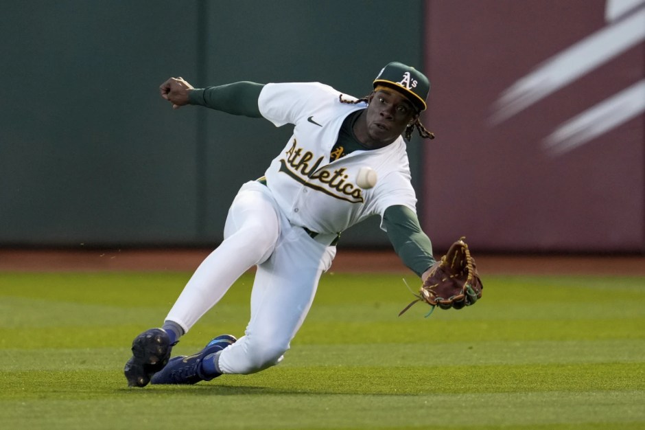 Oakland A’s rightfielder Lawrence Butler (4) makes a dive to catch the baseball in the top of the fourth inning St Louis Cardinals Jordan Walker’s fly ball at the Oakland Coliseum on Mon Apr 15, 2024 (AP News photo)
