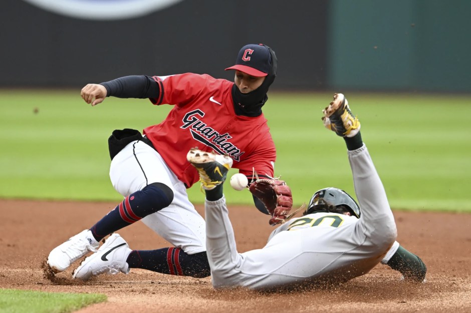 Oakland A’s runner Zack Gelof (20) gets a jump on the throw as the Cleveland Guardians Brayan Rocchio (left) anticipates the late throw in the top of the second inning at Progressive Field in Cleveland (AP News photo)