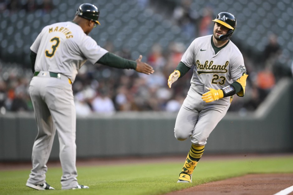 Oakland A’s Shea Langeliers (23) rounds third base after hitting a home run in the top of the first inning and is congratulated by A’s third base coach Eric Martins (3) at Camden Yards in Baltimore on Fri Apr 26, 2024 (AP News photo)