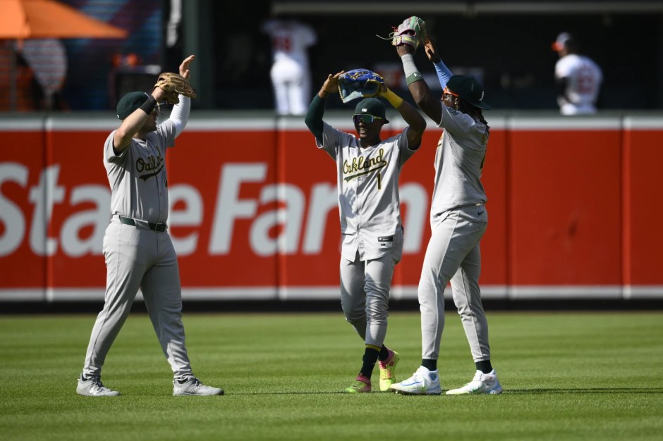 Oakland A’s left to right Seth Brown, Esteury Ruiz, and Lawrence Butler celebrate after defeating the Baltimore Orioles at Camden Yards in Baltimore on Sun Apr 28, 2024 (AP News photo)