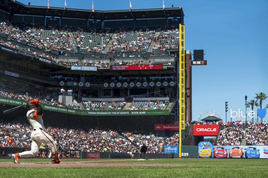 San Francisco Giants Patrick Bailey belts a home run in the bottom of the fifth inning at Oracle Park in San Francisco against the Arizona Diamondbacks on Sat Apr 20, 2024 (AP News photo)