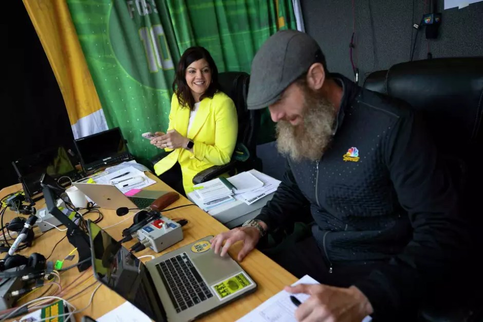 Oakland A’s announcers Jenny Cavnar (left) and Dallas Braden (right) during a broadcast on NBC Sports California in March 2024 during a Cleveland Guardians and Oakland A’s game. Cavnar is the target for a petition drive to get her fired. (photo by Michael Zagaris Oakland A’s photographer)