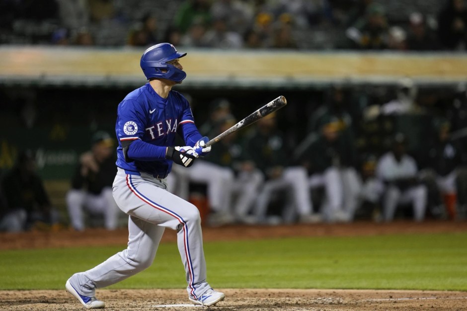 The Texas Rangers Corey Seagar watches the flight of his three run homer against the Oakland A’s in the top of the eighth inning at the Oakland Coliseum on Mon May 6, 2024 (AP News photo)