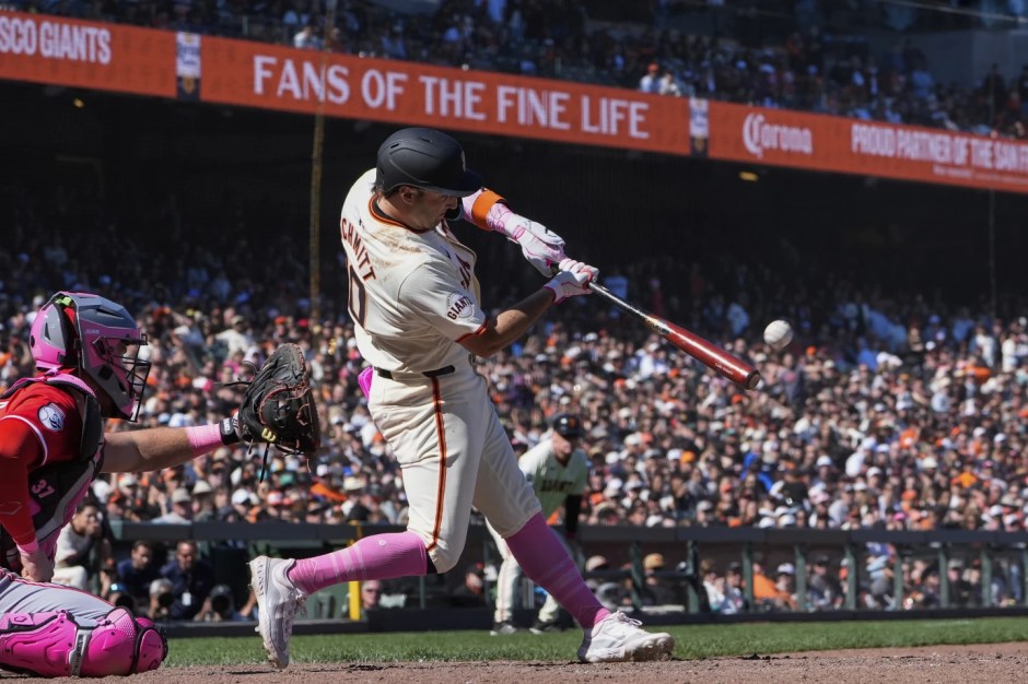 San Francisco Giants Casey Schmitt slugs a ground rule double in the bottom of the tenth inning to score Luis Matos for a walk off hit against the Cincinnati Reds at Oracle Park in San Francisco on Sun May 12, 2024 (AP News photo)