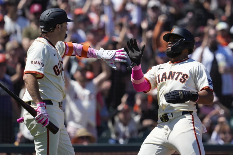 San Francisco Giants Heliot Ramos (right) celebrates with Casey Schmitt (left) after scoring in the bottom of the fifth inning at Oracle Park in San Francisco on Sun May 12, 2024 (AP News photo)