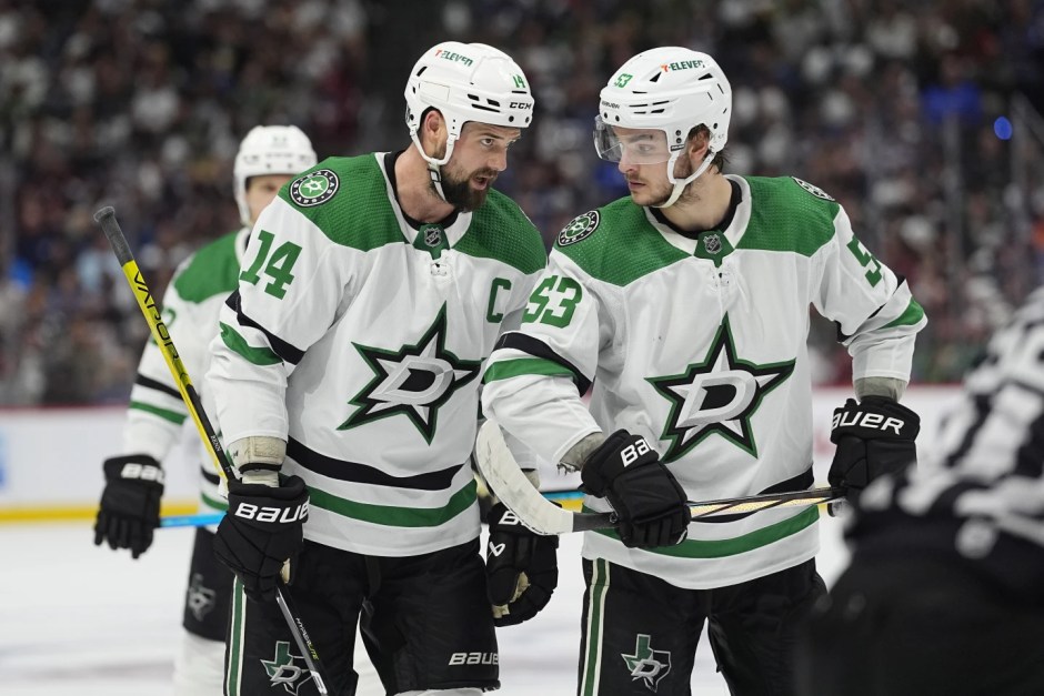 Dallas Stars left wing Jamie Benn (14) talks with center Wyatt Johnson (53) during the second period of game 4 of the second round of the NHL Stanley Cup Playoffs at Ball Arena in Denver on Mon May 13, 2024 (AP News photo)