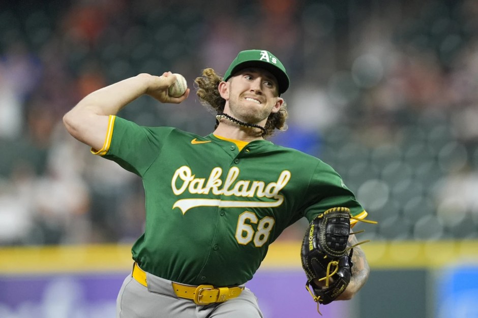 Oakland A’s starter Joey Estes throws against the Houston Astros line up in the bottom of the first inning at Minute Maid Field in Houston on Thu May 16, 2024 (AP News photo)