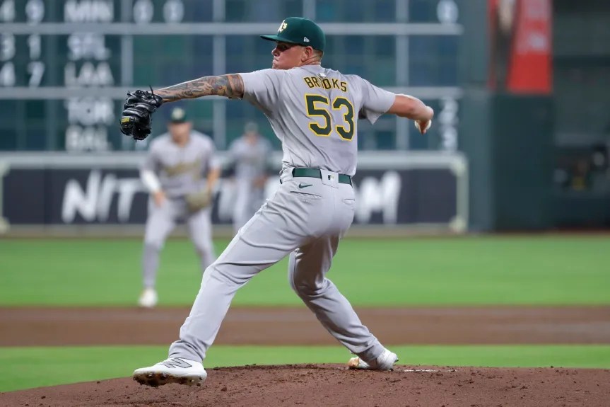 Oakland Athletics starting pitcher Aaron Brooks throws to a Houston Astros batter during the first inning of a baseball game Wednesday, May 15, 2024, in Houston. Brooks will be the A’s starting pitcher on Tue May 21, 2024 vs. the Colorado Rockies in Oakland (AP Photo/Michael Wyke)