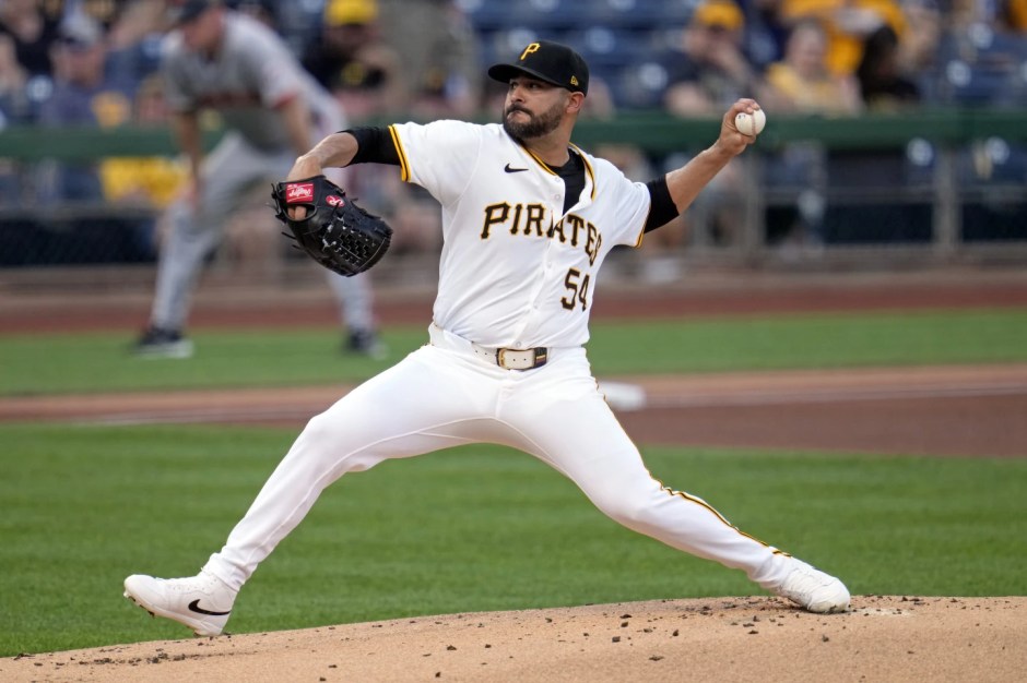 Pittsburgh Pirates starter Martin Perez pitches against the San Francisco Giants at PNC Park in Pittsburgh on Tue May 21, 2024 (AP News photo)