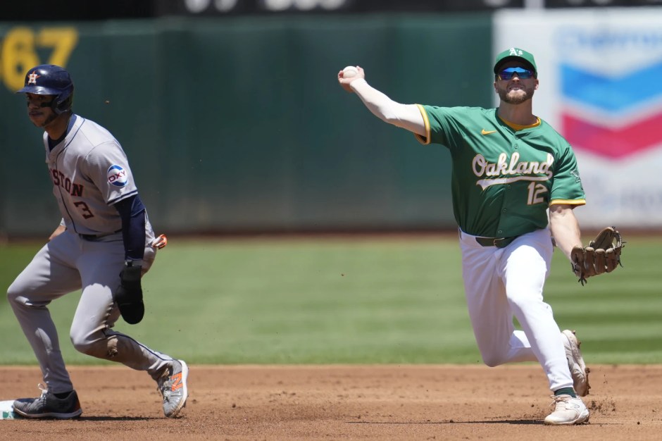 Oakland A’s shortstop Max Schuemann (right) throws to first base after forcing the Houston Astros Jeremy Pena (left) on a double play ball by Jon Singleton in the top of the second inning at the Oakland Coliseum on Sun May 26, 2024 (AP News photo)