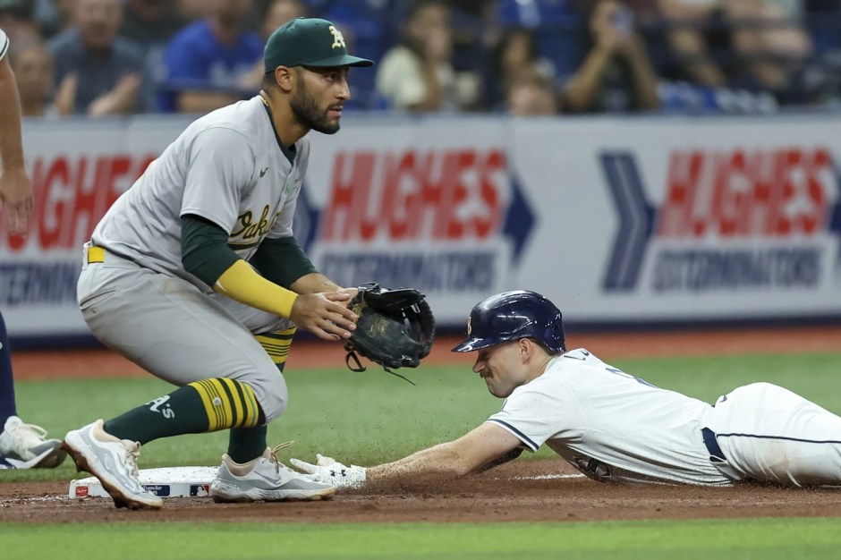 The Tampa Bay Rays Brandon Lowe slides in safely ahead of the ball as the Oakland A’s third baseman Abraham Toro anticipates the throw in the bottom of the fourth at Tropicana Field in Tampa Bay on Wed May 29, 2024 (AP News photo)