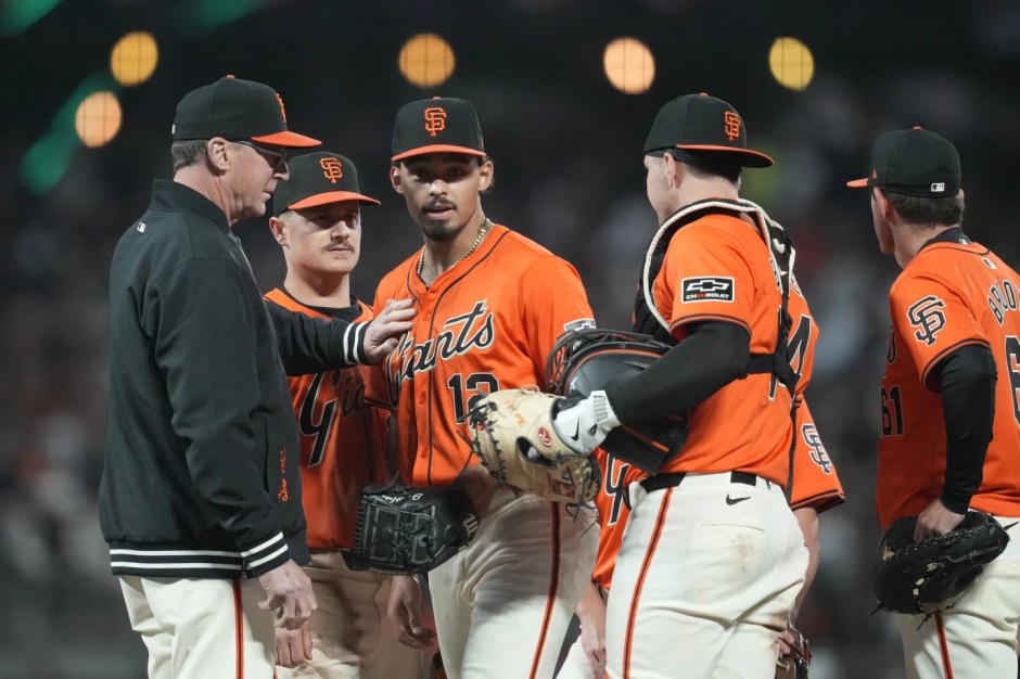 San Francisco Giants pitcher Jordan Hicks (12) gets lifted by Giants manager Bob Melvin (left in dark jacket) in the top of the sixth inning against the New York Yankees at Oracle Park in San Francisco on Fri May 31, 2024 (AP News photo)