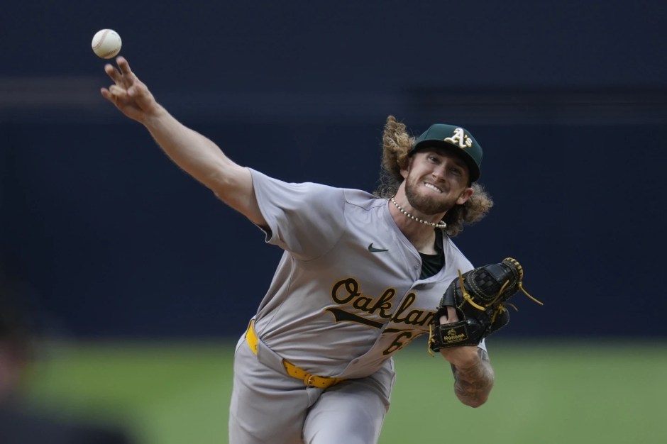 Oakland A’s starter Joey Estes delivers against the San Diego Padres line up in the bottom of the first inning at Petco Park in San Diego on Mon Jun 10, 2024 (AP News photo)