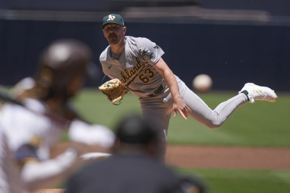 Oakland A’s starter Hogan Harris pitches to the San Diego Padres line up in the top of the first inning at Petco Park in San Diego on Wed Jun 12, 2024 (AP News photo)