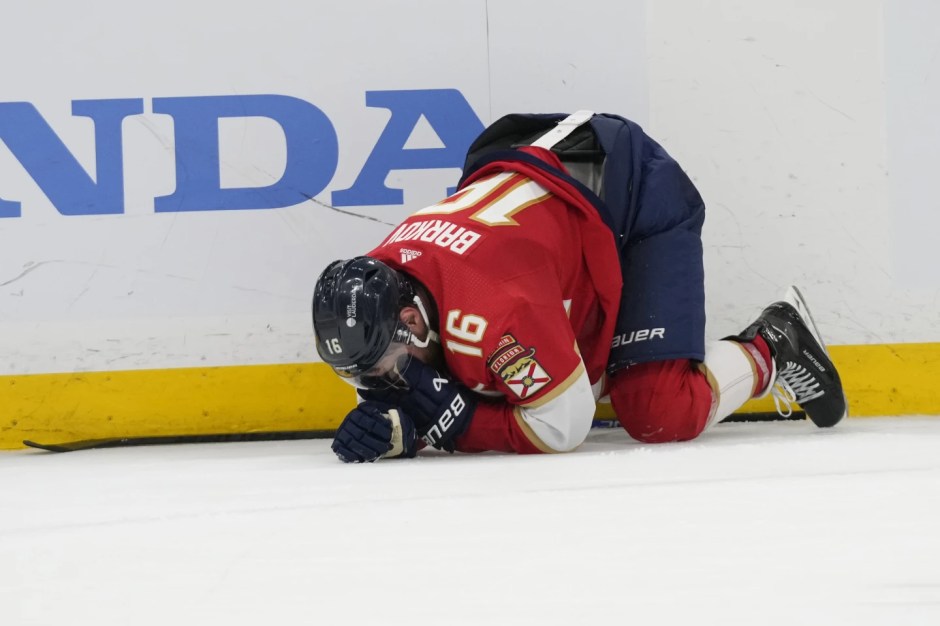 The Florida Panthers Aleksander Barkov kneels on the ice after taking a hit in the jaw from the Edmonton Oilers Leon Draisaitl in the third period of the NHL Stanley Cup Finals game 2 at Scotiabank Arena in Edmonton (AP News photo)