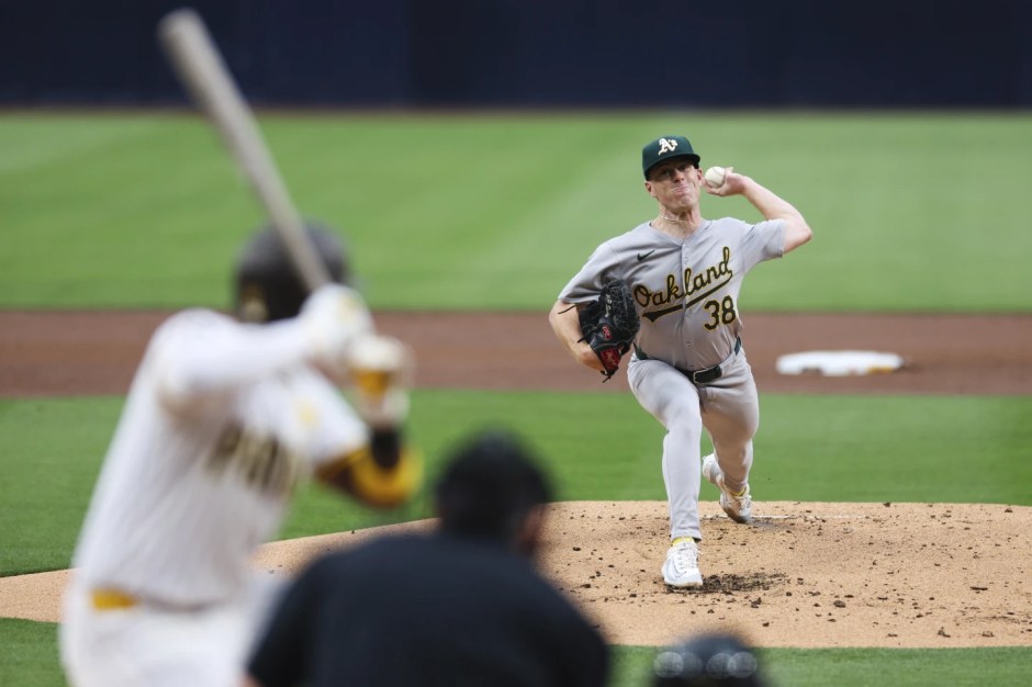 Oakland A’s starter JP Sears fires off a pitch to the San Diego Padre line up in the bottom of the first inning at Petco Park in San Diego on Tue Jun 10, 2024 (AP News photo)