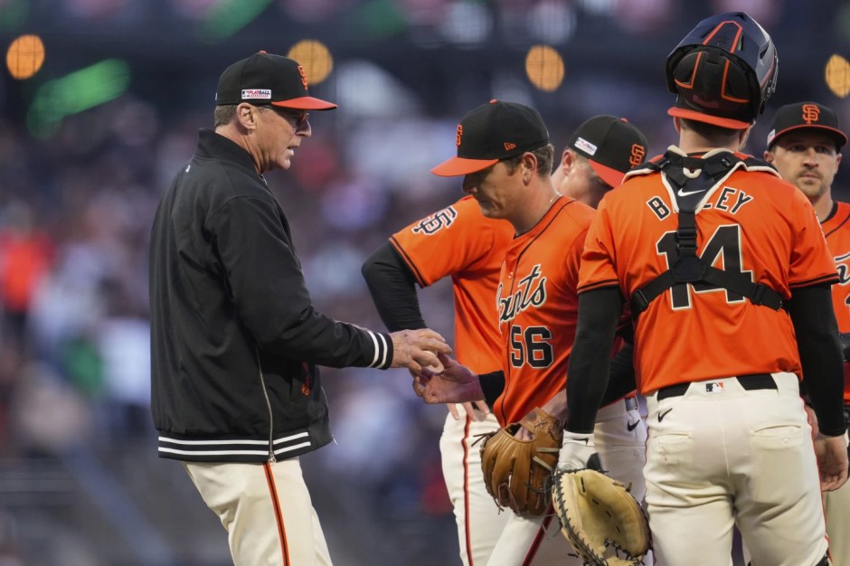 It was a painful exit for San Francisco Giants starting pitcher Howard Spencer (56) as he hands to ball off to manager Bob Melvin (left) in the top of the third inning against the Los Angeles Angels at Oracle Park in San Francisco on Sat Jun 15, 2024