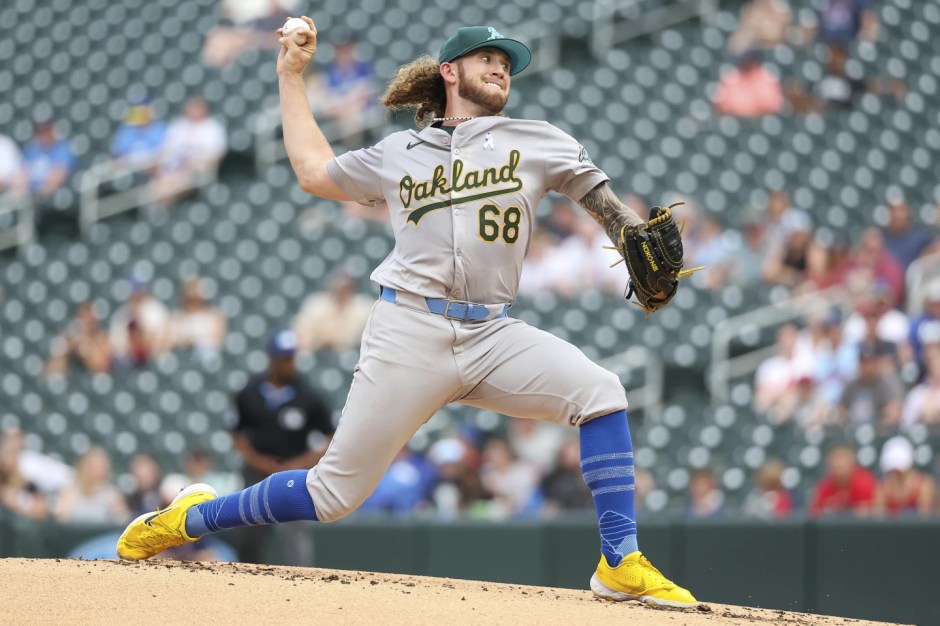 Oakland A’s pitcher Joey Estes (68) delivers a pitch against the Minnesota Twins in the bottom of first inning in the second game of the doubleheader at Target Field in Minneapolis on Sun Jun 16, 2024 (AP News photo)