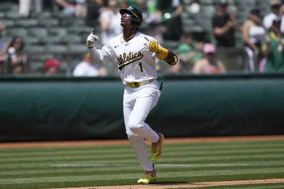 Oakland A’s outfielder Esteury Ruiz who hit a home run on Wed Apr 17, 2024 against the St Louis Cardinals remains out with a left wrist sprain (AP file photo)