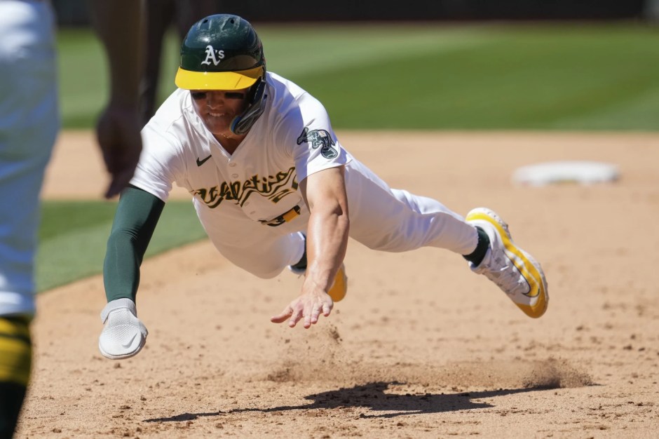 Oakland A’s baserunner Zack Gelof dives back into first base on a Minnesota Twins pick off move in the bottom of the eighth inning at the Oakland Coliseum on Sun June 23, 2024 (AP News photo)