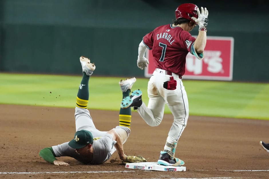 Oakland A’s first baseman Tyler Soderstrom (left) dives towards first base to beat the Arizona Diamondback runner Corbin Carroll (7) to first base in the bottom of the seventh inning at Chase Field in Phoenix on Sat Jun 29, 2024 (AP News photo)