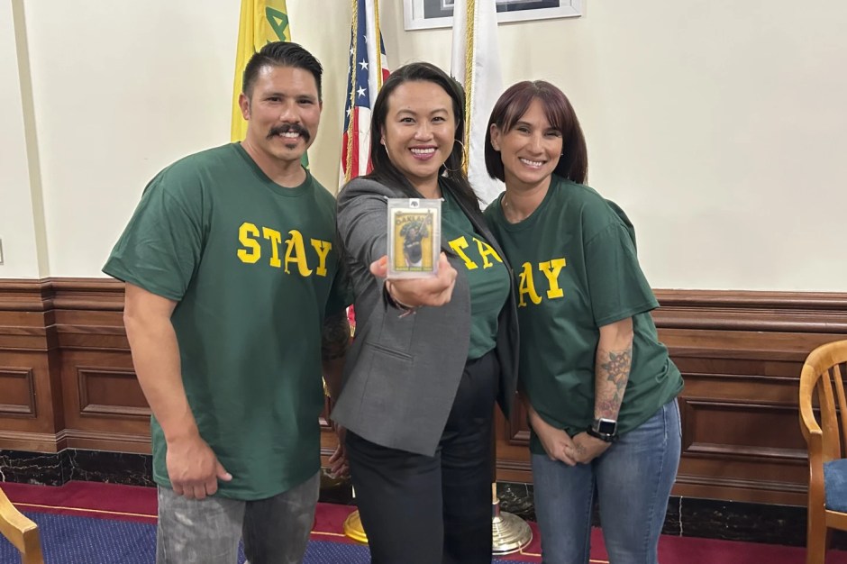 Stephen Lucero (left) who designed a baseball card stands with Oakland Mayor Sheng Thao (center) and Lucero’s wife Chrissy (right) at the mayor’s office on Tue Nov 7, 2023 in their push to keep the A’s in Oakland. This was well before a recall was being considered to oust Thao. (AP News file photo)