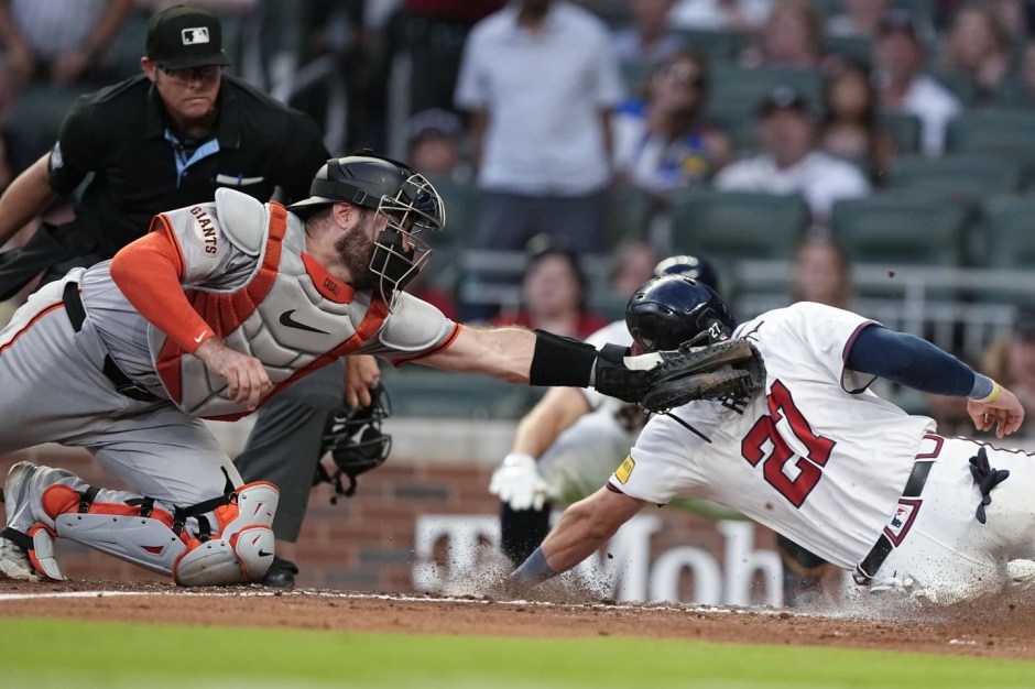 San Francisco Giants catcher Chris Casali (18) puts the tag out on the sliding Atlanta Braves Austin Riley (27) in the bottom of the fifth inning at Truist Field in Cobb County GA on Wed Jul 3, 2024 (AP News photo)