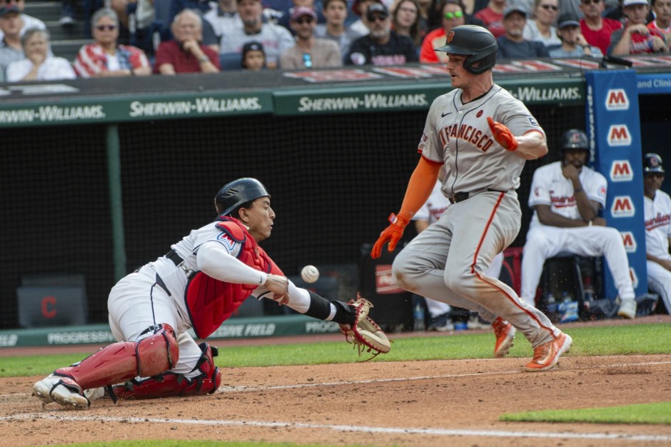 Cleveland Guardians catcher Bo Naylor (left) can’t get the the throw as the San Francisco Giants Matt Chapman (right) slides safely at home in the bottom of the fifth inning at Progressive Field in Cleveland on Sat Jul 6, 2024 (AP News photo)