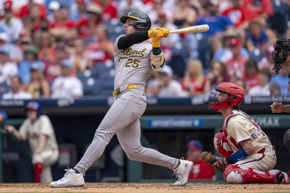 Oakland A’s Brent Rooker slugs a top of the fourth inning two run home run against the Philadelphia Phillies at Citizens Bank Ballpark in Philadelphia on Sun Jul 14, 2024 (AP photo)