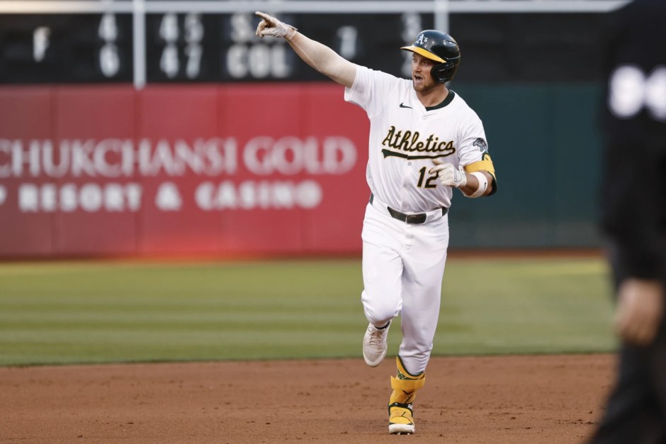 The A’s went ahead in the bottom of the third. Wilson went to second on a disengagement violation after his leadoff single. Max Schuemann beat out a grounder to third, and both runners scored on Lawrence Butler’s triple. Neto’s 13th homer of the year, a 397 foot fly clearly fair, but not by much, to left, evened the score in the top of the fourth.