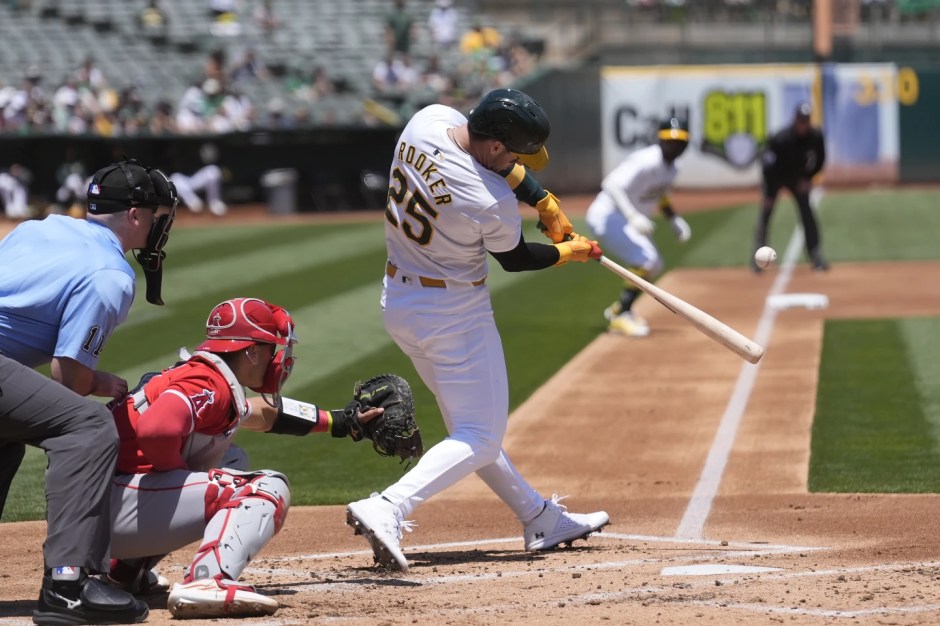 Oakland A’s Brent Rooker (25) slugs a bottom of the first inning three run home run in front of the Los Angeles Angels catcher Logan O’Hoppe at the Oakland Coliseum on Sat Jul 20, 2024 (AP News photo)