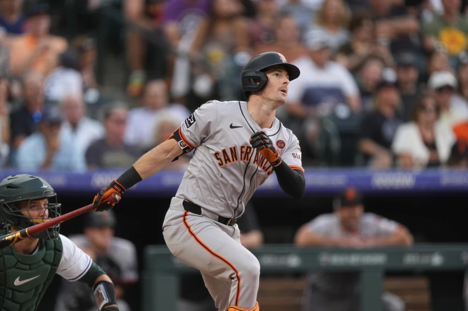 The San Francisco Giants and Mike Yastrzemski seen here hitting a fifth inning triple against Colorado Rockies pitcher Kyle Freeman at Coors Field on Sat Jul 20, 2024 are hoping to avoid a three game sweep today (AP News photo)