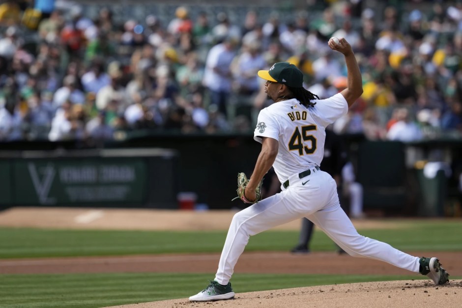 Oakland A’s starter Osvaldo Bido in the top of the first inning against the San Francisco Giants at the Oakland Coliseum on Sat Aug 17, 2024 (AP News photo)