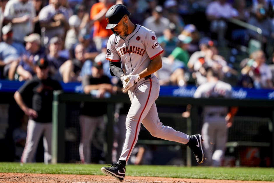 San Francisco Giants Grant McCray jogs the bases after hitting a top of the eighth inning home run against the Seattle Mariners at T Mobile Park in Seattle on Sun Aug 25, 2024 (AP News photo)
