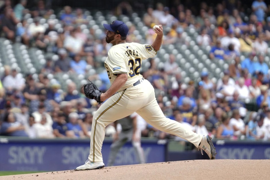 Milwaukee Brewers starter Aaron Civale was dealing against the San Francisco Giants throwing a combined two hit shutout at American Family Park in Milwaukee on Thu Aug 29, 2024 (AP News photo)