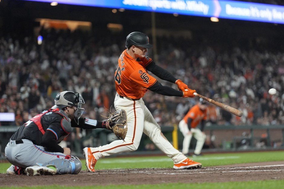 San Francisco Giants Matt Chapman slugs a three run double to clear the bases in the bottom of the eighth against the Miami Marlins at Oracle Park on Fri Aug 30, 2024 (AP News photo)