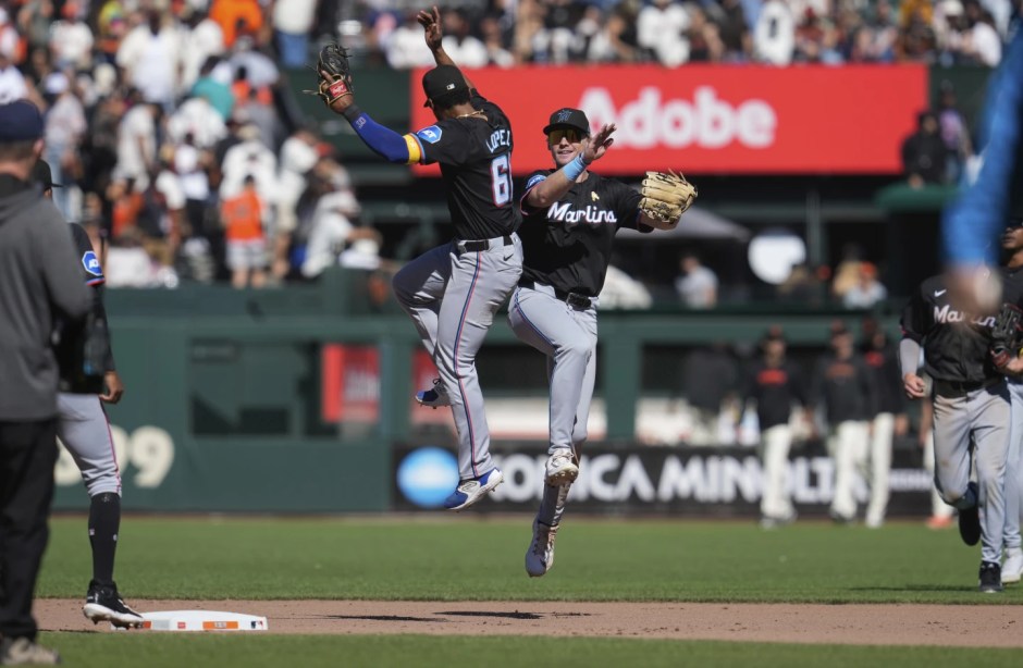 Miami Marlins shortstop Otto Lopez (center-left) and left fielder Kyle Stowers (center-right) jump for joy after taking two out of three from the San Francisco Giants at Oracle Park in San Francisco on Sun Sep 1, 2024 (AP News photo)