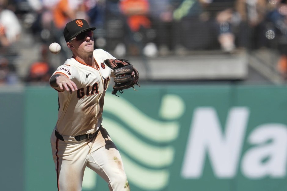 San Francisco Giants shortstop Tyler Fitzgerald throws out the Miami Marlins Otto Lopez at first base at Oracle Park in San Francisco on Sun Sep 1, 2024 (AP News photo)