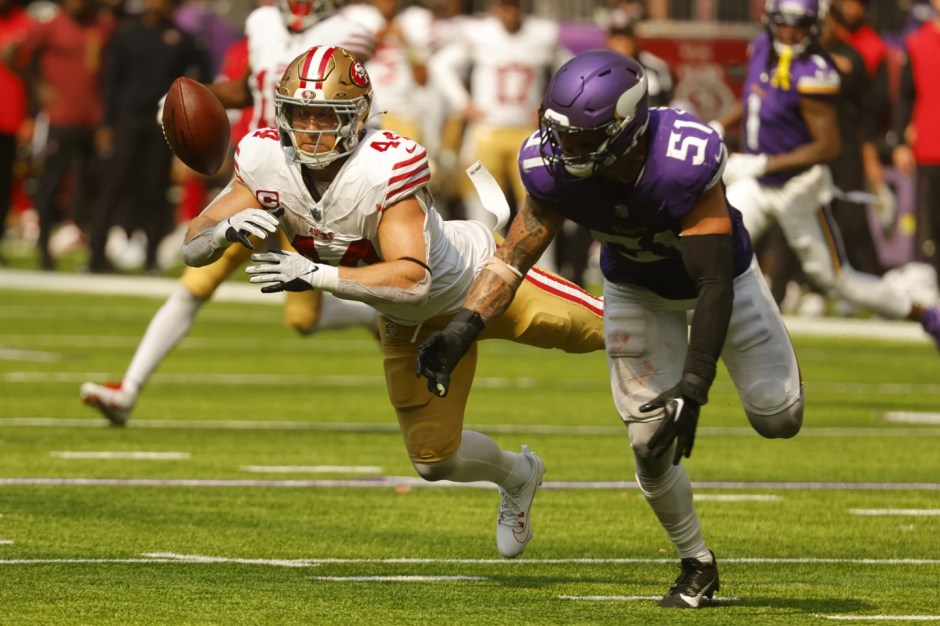 Minnesota Vikings linebacker Blake Cashman (51) breaks up a pass that was intended for San Francisco 49ers fullback Kyle Juszcyk (44) in second half action at US Bank Field in Minneapolis on Sun Sep 15, 2024 (AP News photo)