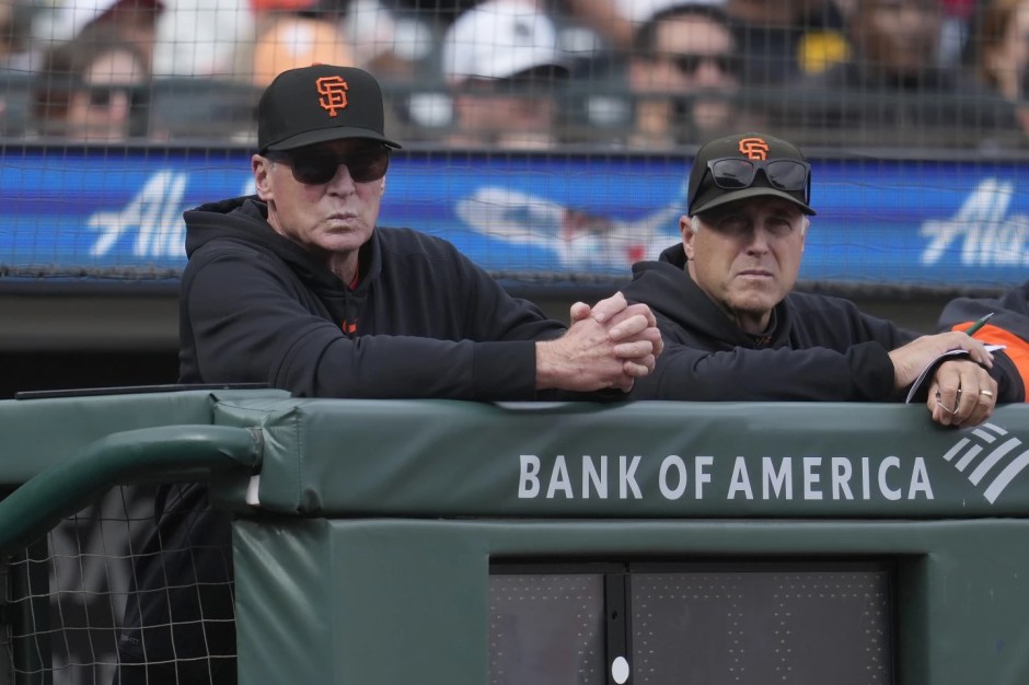 San Francisco Giants manager Bob Melvin (left) and pitching coach Bryan Price (right) watch the Giants and San Diego Padres in the ninth inning at Oracle Park in San Francisco on Sun Sep 15, 2024 (AP News photo)