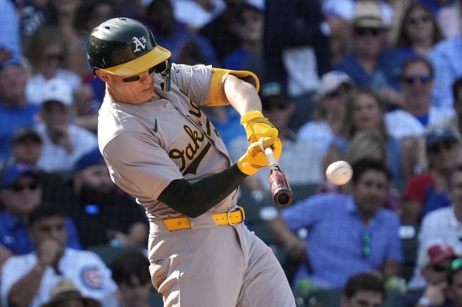 Oakland A’s Zack Gelof connects for a eighth inning one run double against the Chicago Cubs at Wrigley Field on Wed Sep 18, 2024 (AP News photo)
