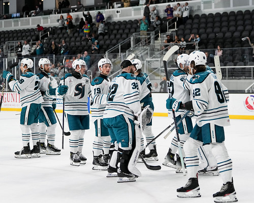 The San Jose Barracuda celebrate their 42 victory over the Bakersfield Condors at Tech CU Arena on Sunday OCT 6, 2024. (San Jose Barracuda)