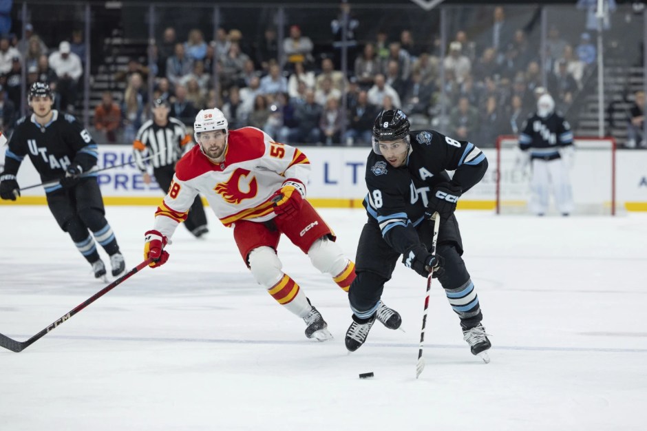 Utah Hockey Club center Nick Schmaltz (8) controls the puck against the Calgary Flames center Justin Kirkland (58) in the first period at Delta Center in Salt Lake City on Wed Oct 30, 2024 (AP News photo)