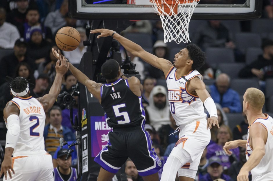 Sacramento Kings guard DeAaron Fox (5) is guarded by the Phoenix Suns forward Josh Okogie (2) and Ryan Dunn (0) at Golden One Center in Sacramento on Wed Nov 13, 2024 (AP News photo)