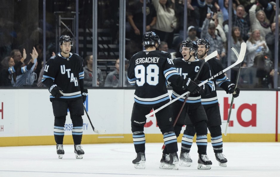 Utah Hockey Club Mikhail Sergachev (98) celebrates with teammates after scoring against the Vegas Golden Knights at the Delta Center in Salt Lake City on Fri Nov 15, 2024 (AP News photo)