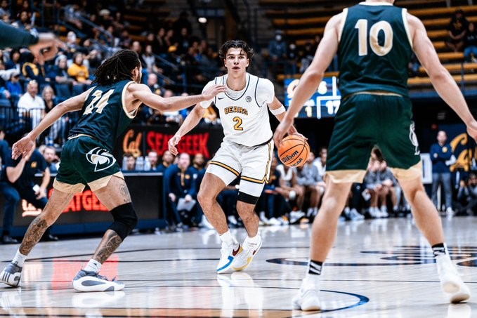 Cal Bears guard Andrej Stojakovic (2) takes the ball up the floor against the Sacramento State Hornets guard Julian Vaughns (24) and guard Emil Skytta (10) at Haas Pavilion in Berkeley on Sun Nov 24, 2024 (Cal Bears X photo)