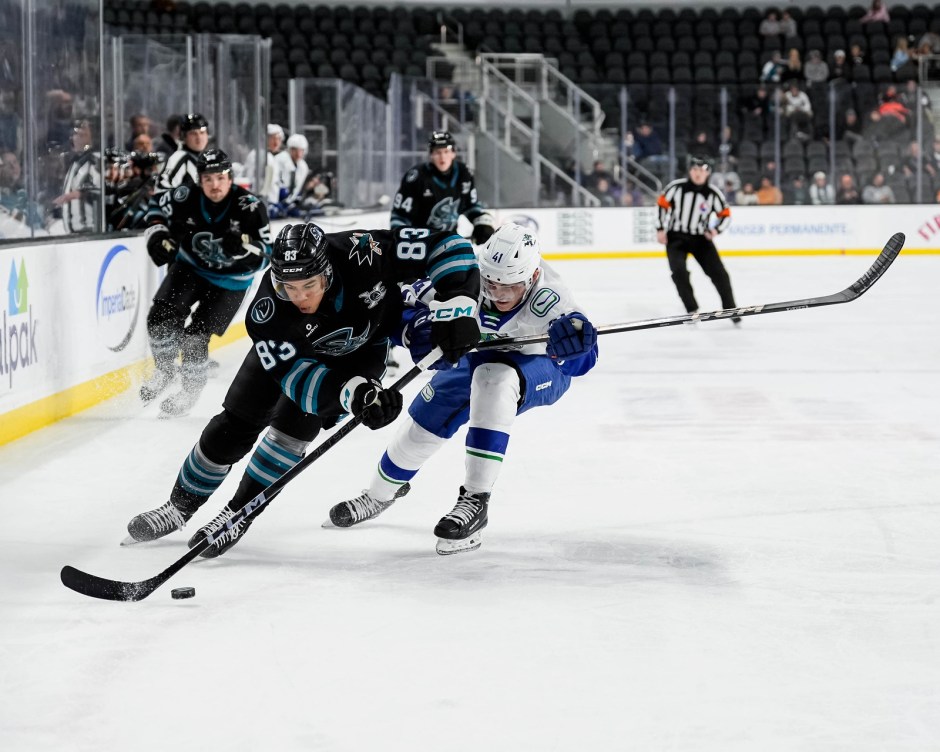 San Jose Barracuda Donovan Houle (83) battles with Abbottsford Canucks Akito Hirose (41) for the puck at Tech CU in San Jose on Fri Nov 29, 2024 (photo from San Jose Barracuda X)