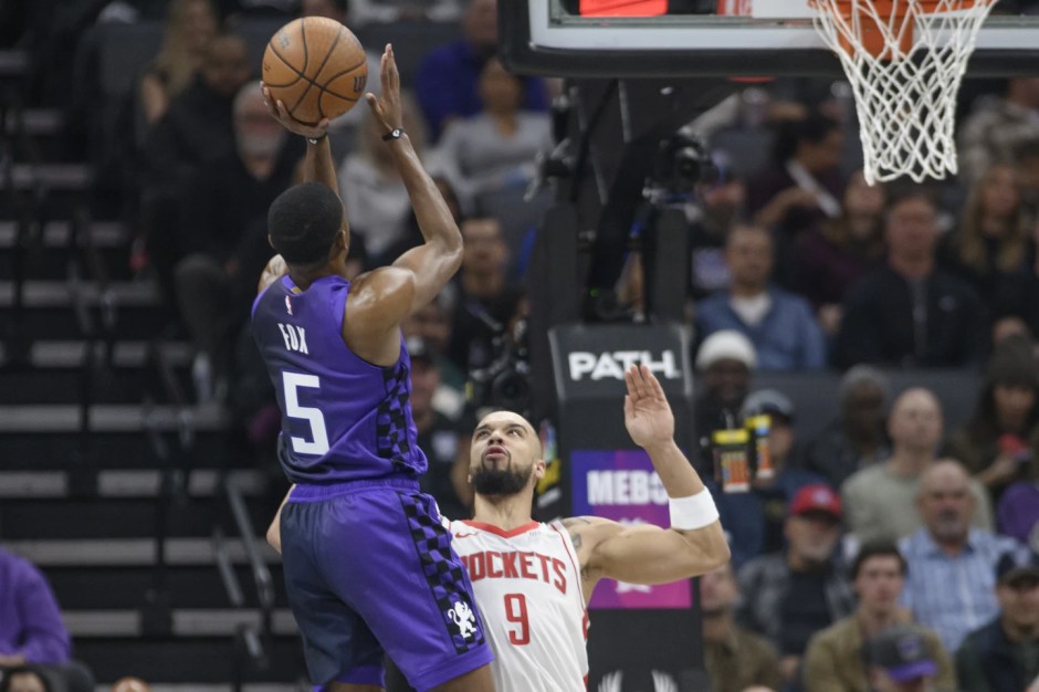 Sacramento Kings guard De’Aaron Fox (5) takes a shot over the Houston Rockets forward Dillon Brooks (9) in the first half at Golden 1 Center in Sacramento on Wed Dec 4, 2024 (AP News photo)