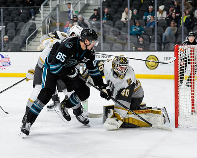 San Jose Barracuda defenseman Shakir Mukhamadullin (#85) delivers a shot in front of the crease while Henderson Silver Knights goaltender Akira Schmid (#40) does his best to keep the puck out of the net at Tech CU Arena on Friday JAN 31, 2025. (San Jose Barracuda)
